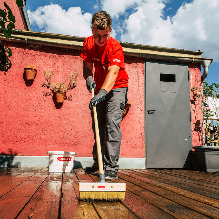 • Схема работы с продуктом аналогична для всех пригодных оснований. Очиститель обильно наносится на поверхность. Выждать около 10–20 мин, поддерживая поверхность во влажном состоянии, например, с помощью пульверизатора. Затем промыть с большим количеством воды, удаляя щеткой загрязнения, находящиеся в порах древесины. При необходимости процесс повторить.
