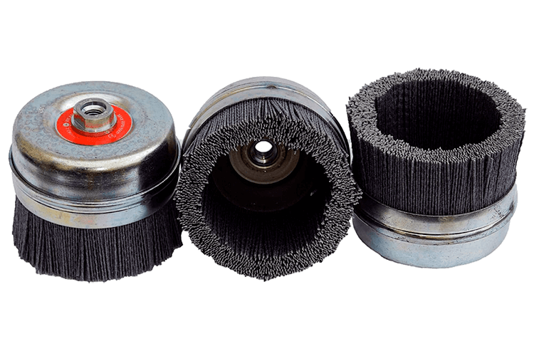 Щетка в стальном корпусе с прижимным кольцом. Ворс из современного полиамидного волокна с равномерно распределенными зёрнами абразива. Абразив - карбид кремния (Silicium-carbid), который находится в массе волокна.