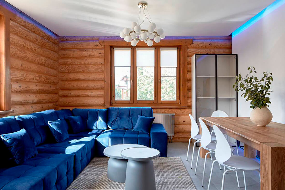 В обновлённом интерьере микс минимализма и фактурного бревна. После переделки, с одной стороны, сохранен дух бревенчатого дома. Благодаря герметизации в швах в гостиной значительно лучше сохраняется тепло. С другой стороны, в интерьер добавили много современного, гостиная превратилась в уютное пространство, где можно провести время с семьёй и встретить гостей.